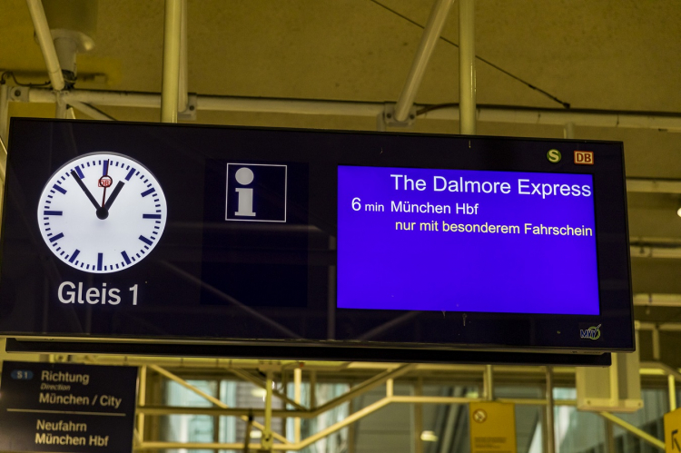 »The Dalmore Express - journey only possible with special ticket«, read the display board on platform 1 at Munich Central Station. The 21 invited guests eagerly awaited the arrival of the impressive »The Dalmore Express« and the start of an extraordinary journey. Already the travel time became a special experience. The destination was the legendary Schloss Elmau, where Bastian Drews, the whisky expert and Brand Ambassador of Whyte & Mackay, would later present the Dalmore 21 Year Old.