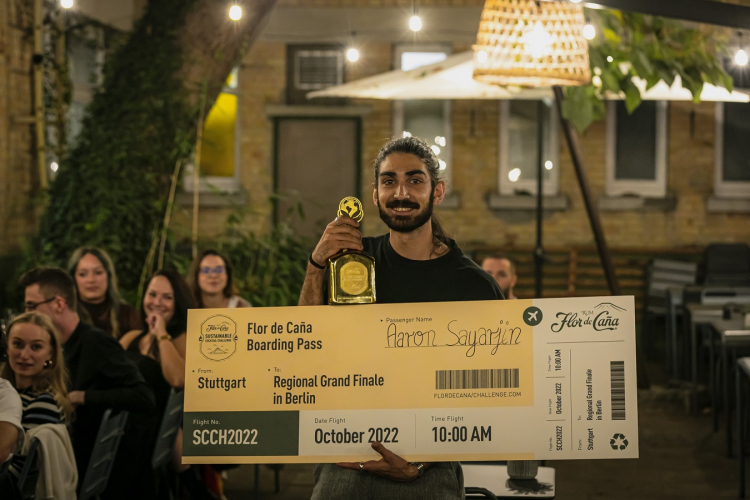 Aaron Sayarjin from Roomers Bar Baden-Baden. He won first place with his cocktail »KiBu«. The lucky winner received a competition trophy made of sustainable materials, a super premium bartender kit, a bottle of Flor de Caña Rum 25 years, a cash prize and the opportunity to represent his country in the regional final during the Bar Convention Berlin in October 2022. There, it will be decided who gets to compete for the title of "Flor de Caña's World's Most Sustainable Bartender" and $10,000 in prize money at the global final of the Sustainable Cocktail Challenge in Nicaragua in 2023.